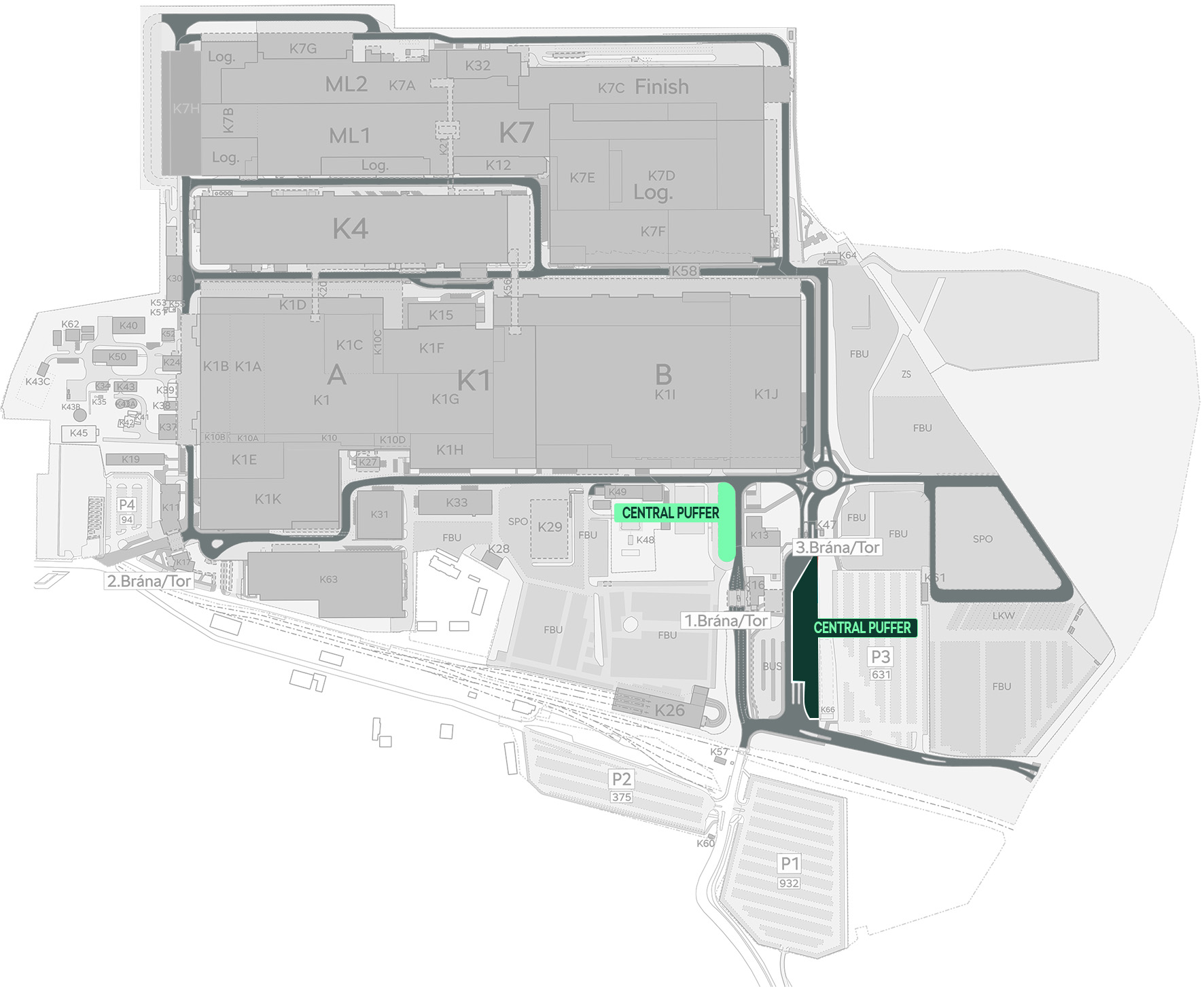 Tady máte znázorněné, kde v závodě se nachází. Pokud jste právě absolvoval vstupní odbavení, zůstaňte na parkovišti označeném černě. Pokud máte za sebou již nějaký sklad a čekáte na další, vyčkejte na světle zeleném.