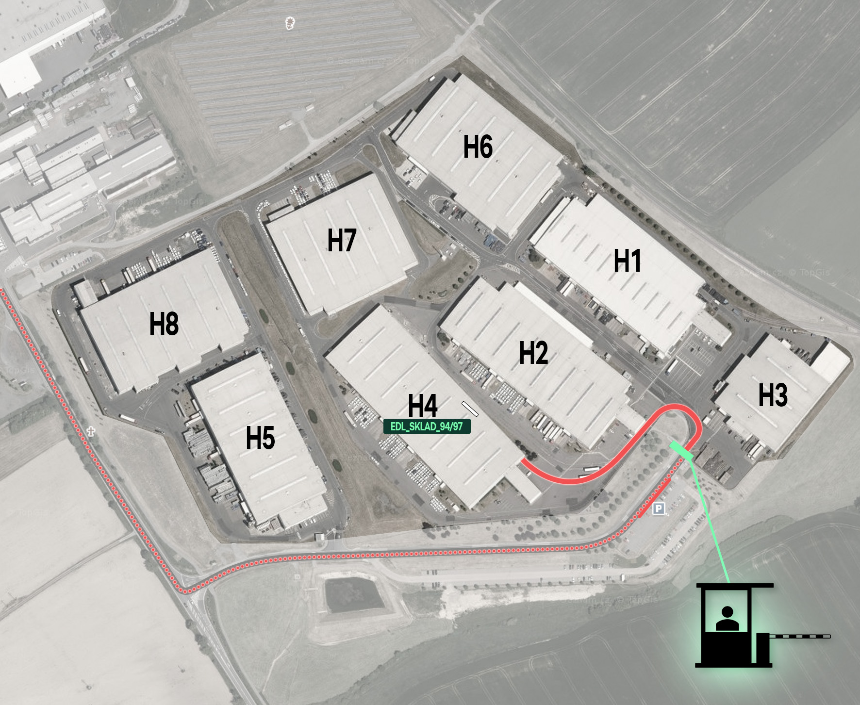 Sklady EDL se nachází mimo areál Škoda Auto Kvasiny. Tady máte znázorněnou trasu z parkoviště na bránu areálu EDL. Zastavte v odstavném pruhu před bránou a běžte se nahlásit na vrátnici.
