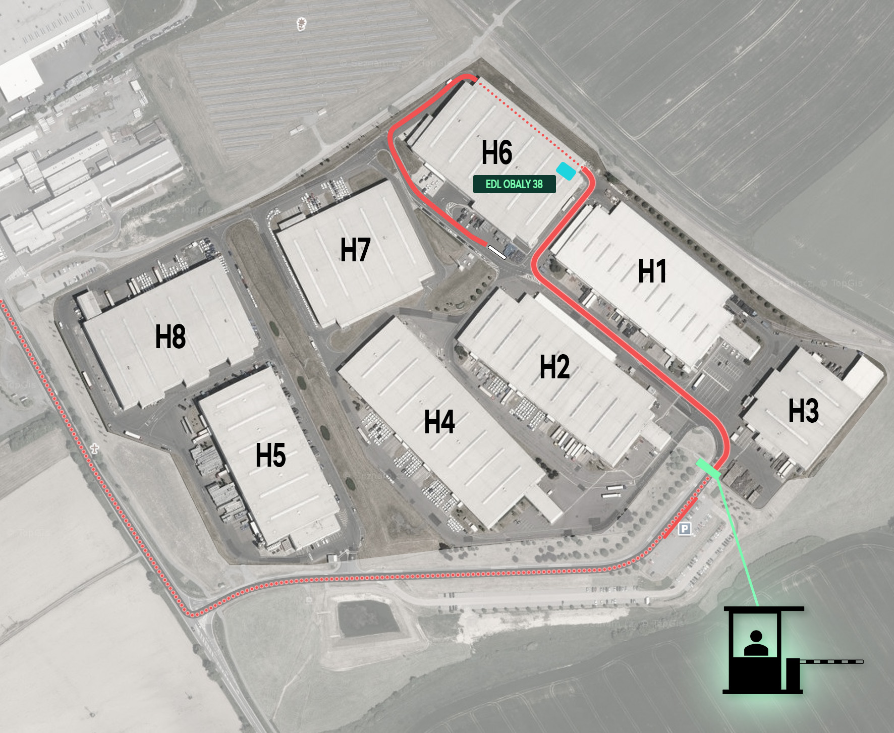 Trasa na Váš sklad v areálu EDL. Je potřeba se zastavit v příjmové kanceláři pro nakládkový list. (modře označeno).