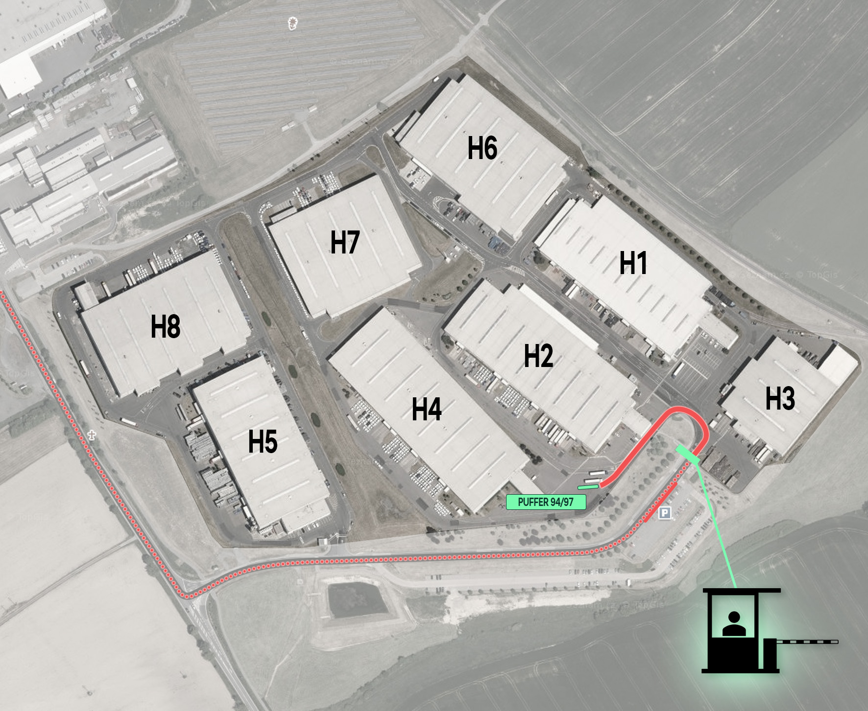 Sklady EDL se nachází mimo areál Škoda Auto Kvasiny. Tady máte znázorněnou trasu z parkoviště na bránu areálu EDL. Zastavte v odstavném pruhu před bránou a běžte se nahlásit na vrátnici.
