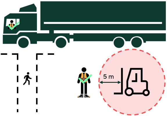 Přiblížení k vozíku na méně než 5 m pouze za předpokladu, že vozík není v pohybu, vozík nemá břemeno a udržujete oční kontakt s řidičem.