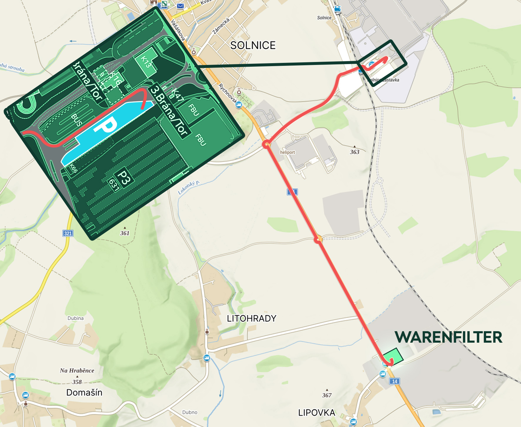 Sklad se nachází mimo areál Škoda Auto Kvasiny. Tady máte znázorněnou trasu z parkoviště na bránu areálu.