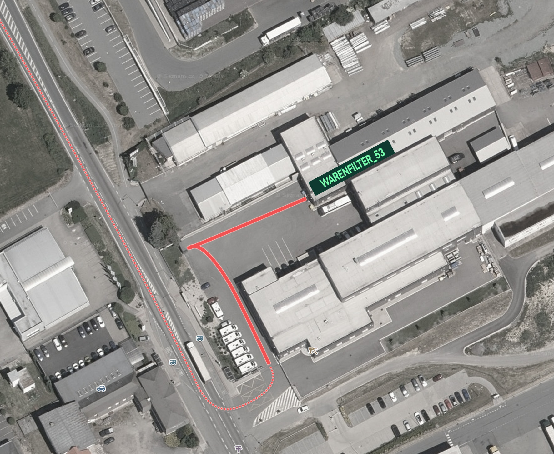 Trasa na Váš sklad v areálu. Do skladu je nutné nacouvat!